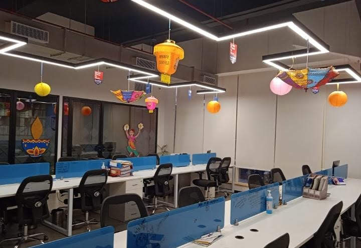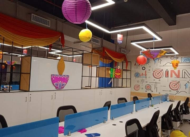 - Diwali Office Decoration – Traditional rangoli, warm fairy lights, decorative lanterns, and customized festive backdrops designed to enhance the celebratory ambiance